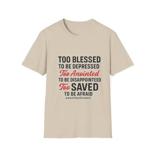 Faith Graphic T-Shirt — "Too Blessed, Too Anointed, Too Saved" Inspirational Christian Tee
