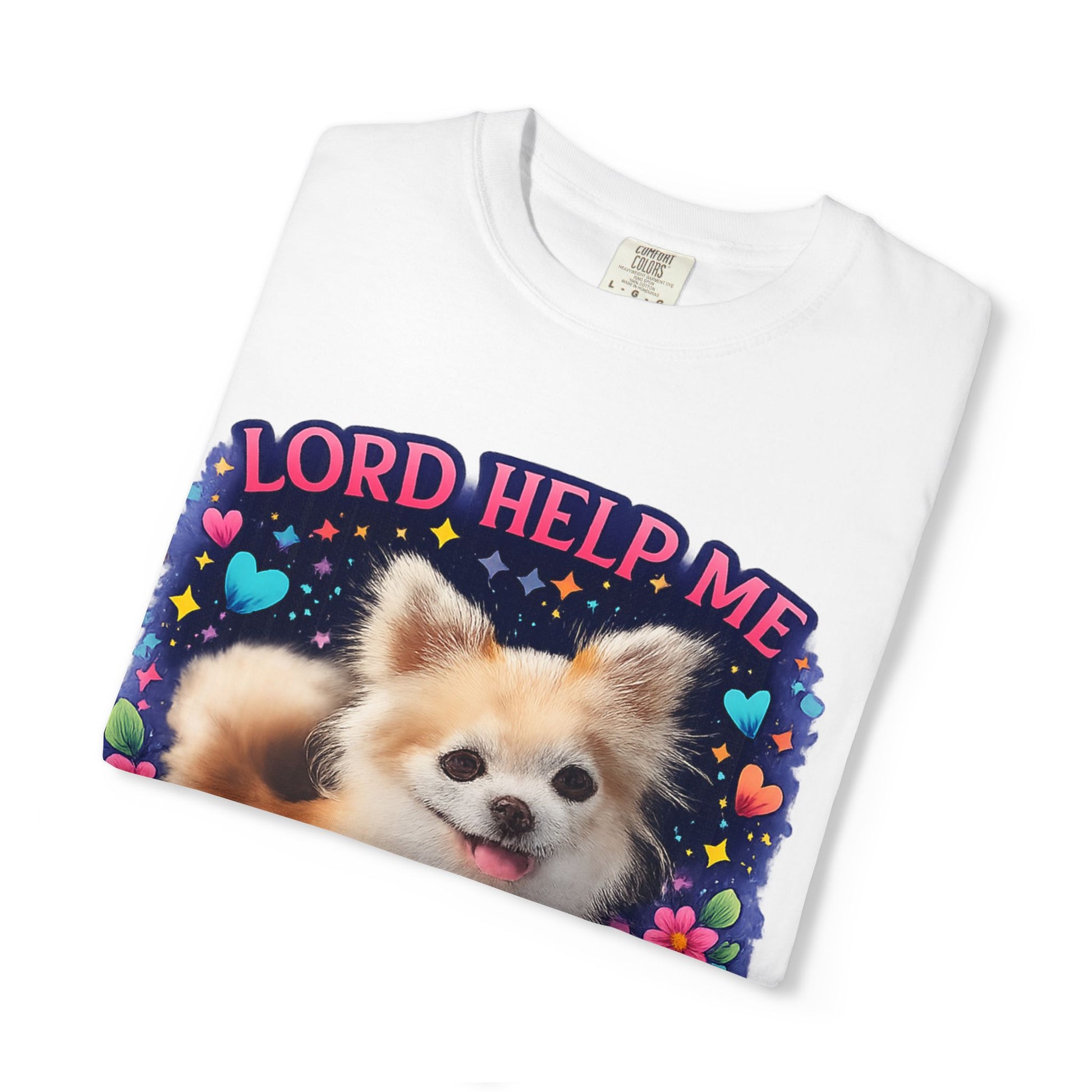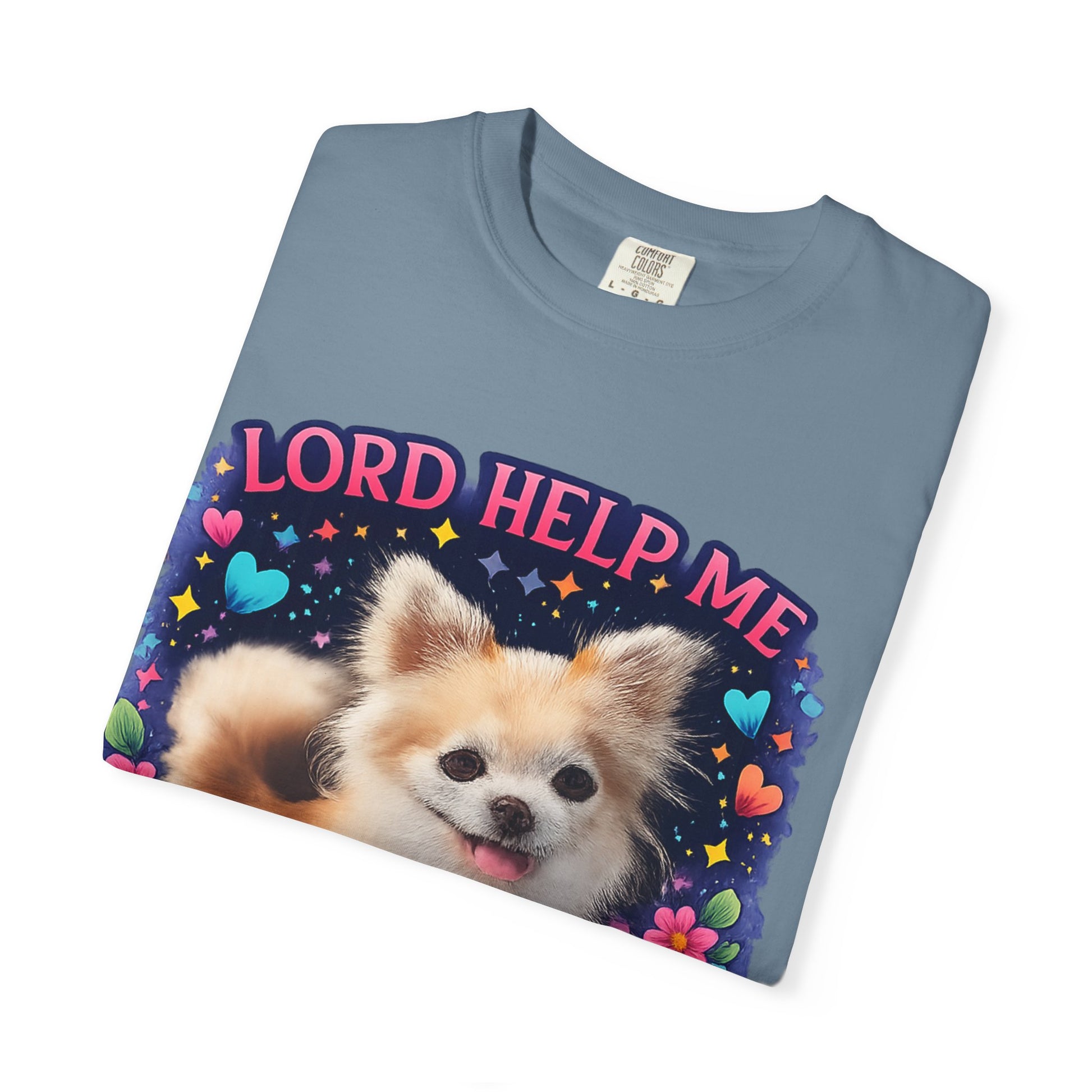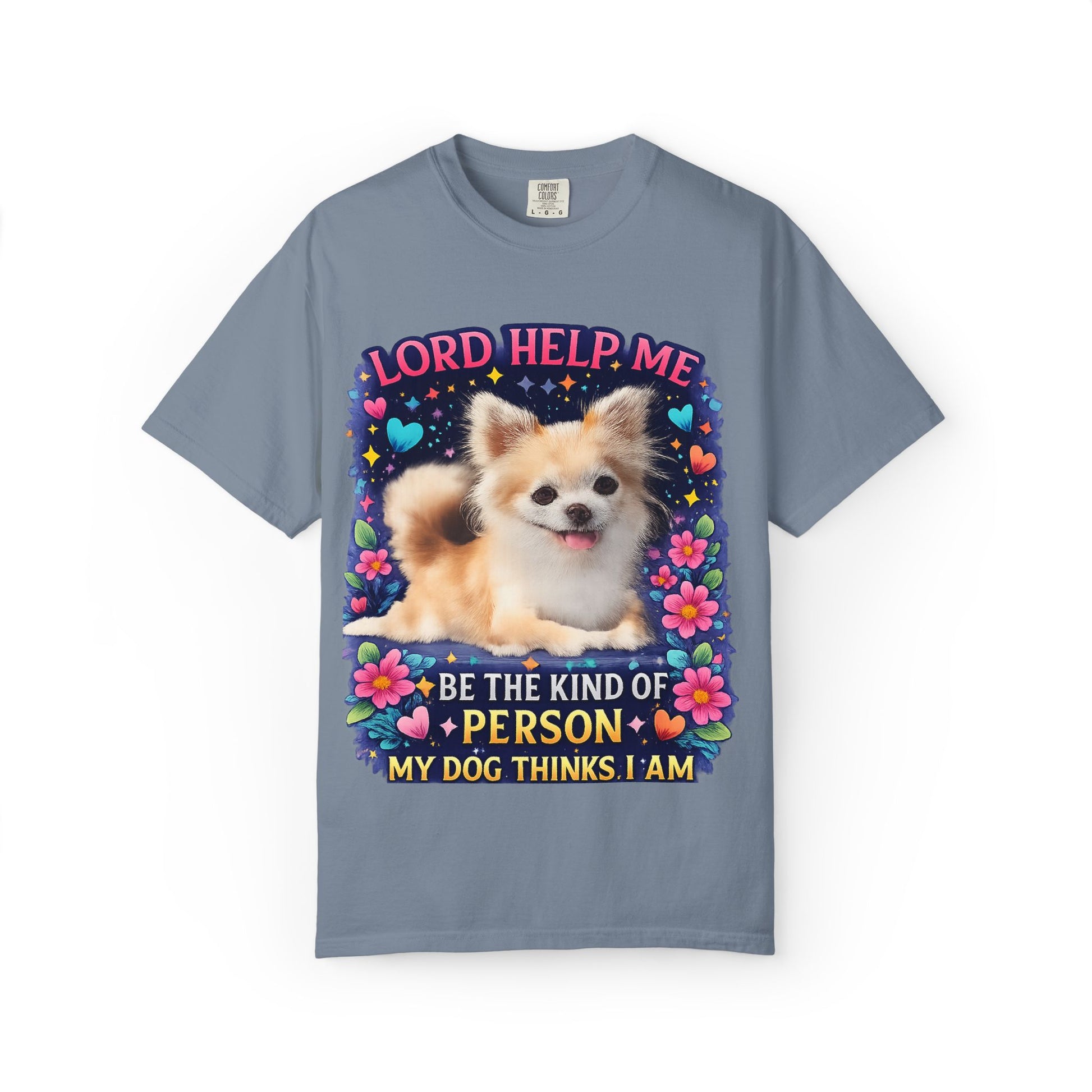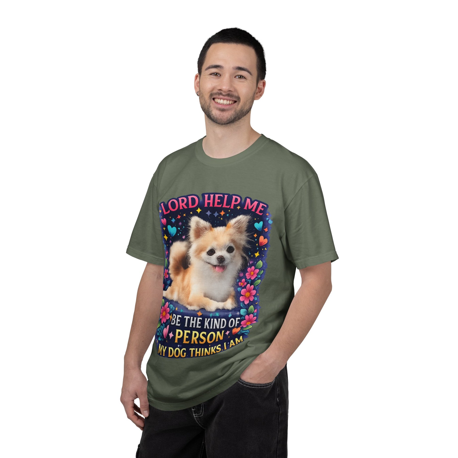 Soft, substantial, and warm-hearted — this garment-dyed tee carries a little pocket of joy front and center. A fluffy pup smiles from a colorful, floral frame with the playful line, “Lord help me be the kind of person my dog thinks I am.” The heavyweight cotton feels lived-in from day one thanks to post-construction dyeing, while the relaxed cut and pre-shrunk ring‑spun fabric make it comfortable for everyday wear. Wear it on casual mornings with coffee, at dog-park walks, or layered under a jacket for a weekend out. The sewn-in label and durable double-needle stitching mean this shirt will hang in your closet and keep earning compliments — just like the tiny canine muse printed on the chest.