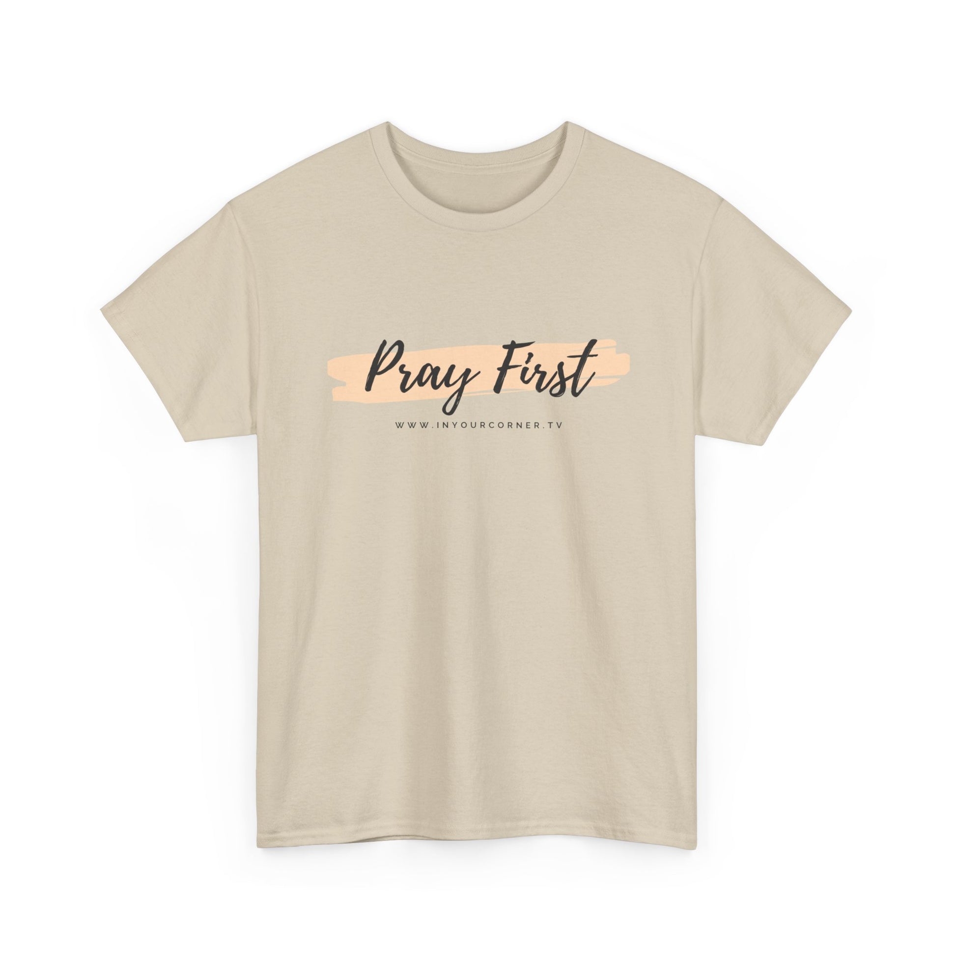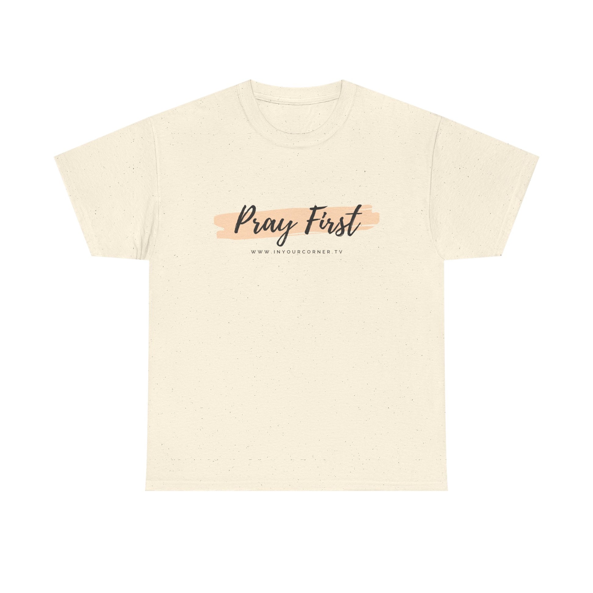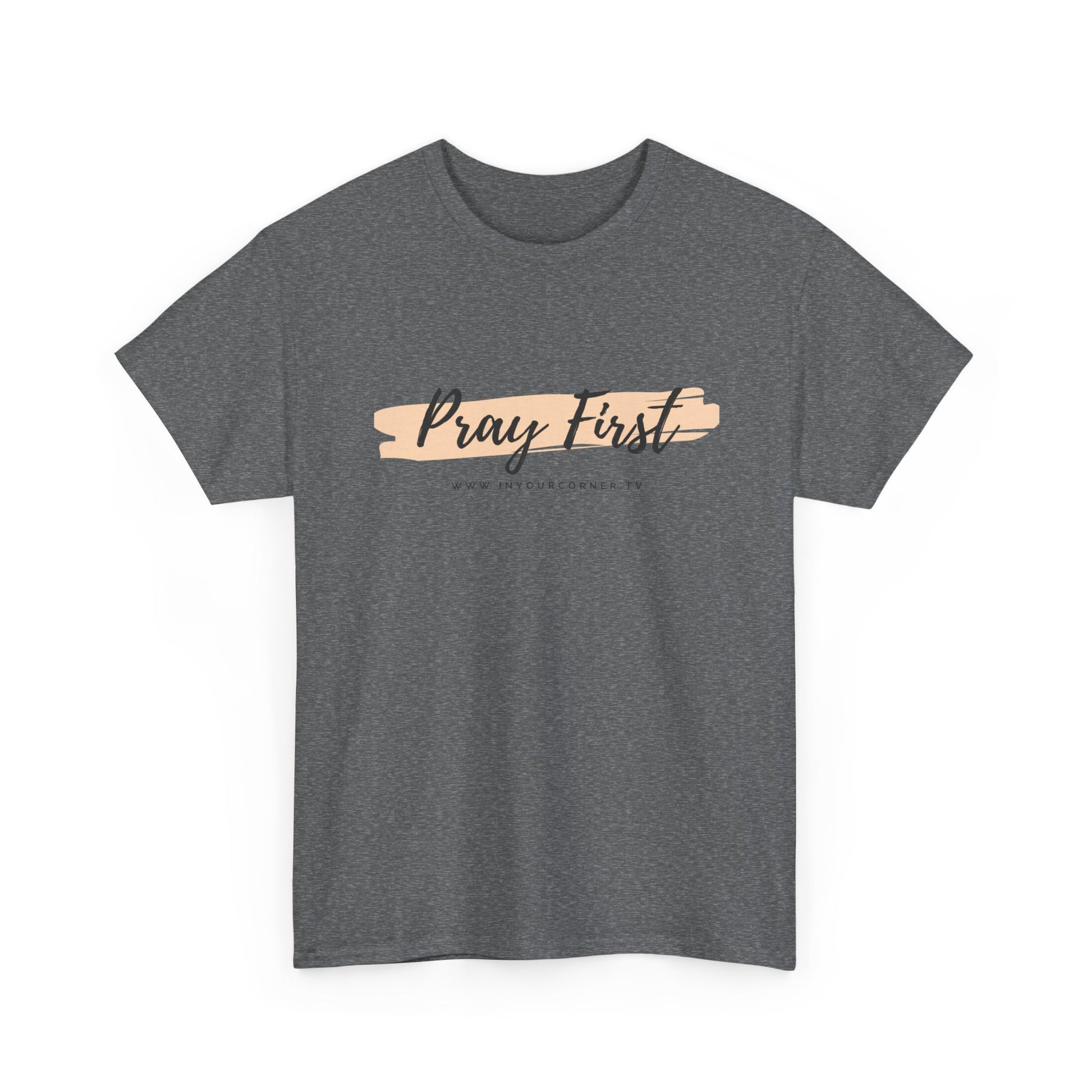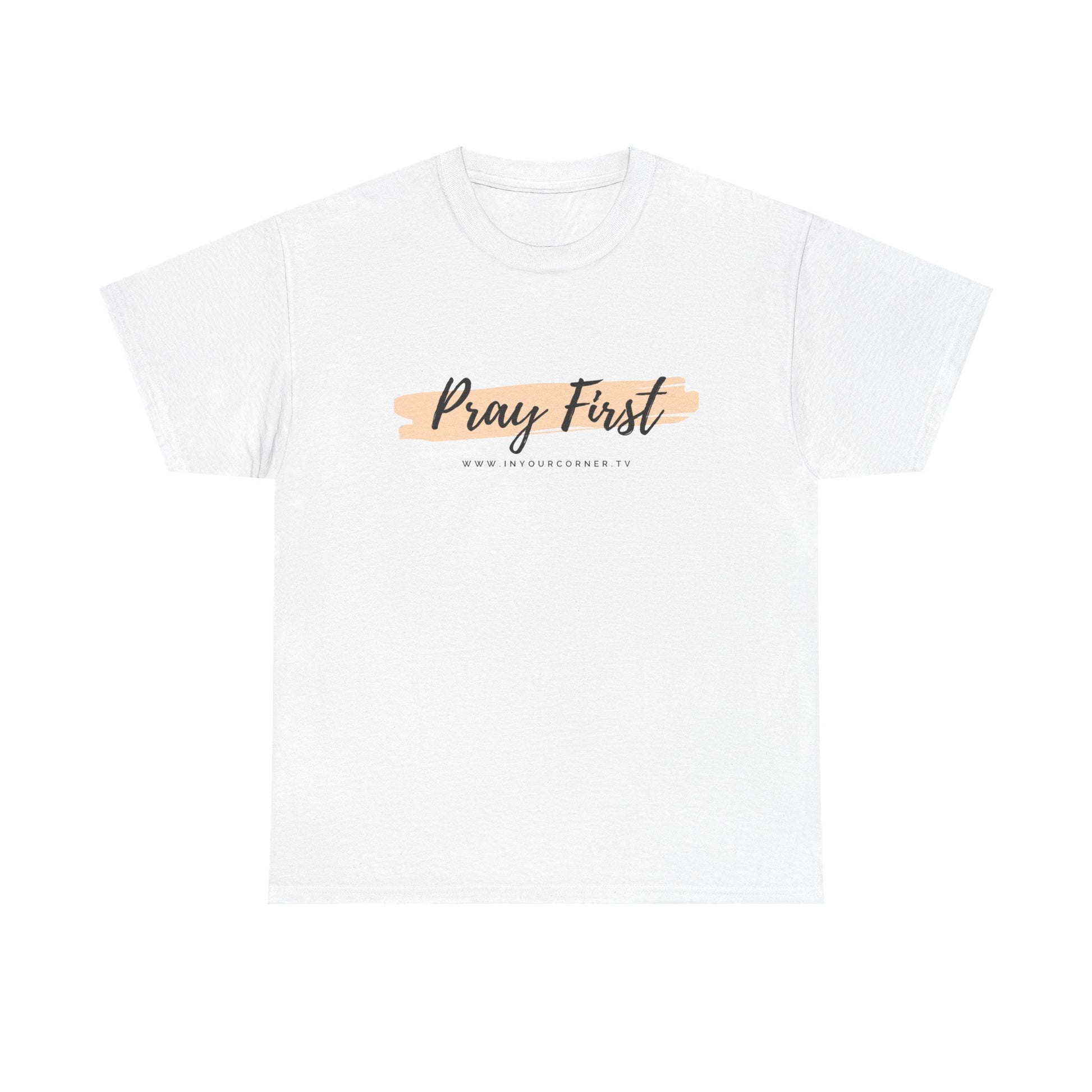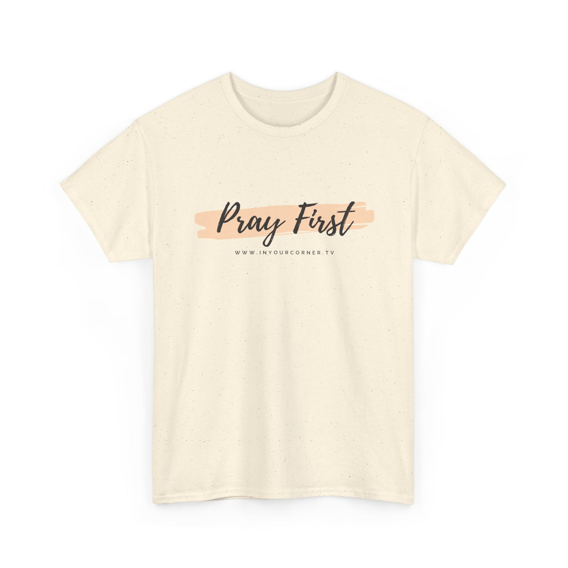 This soft cotton tee carries a quiet message: Prayer First. The design pairs a gentle brushstroke of warm peach with modern, hand-lettered script—subtle, personal, and easy to wear. Lightweight but sturdy, the shirt sits relaxed at the shoulders and breathes through everyday rhythms: morning coffee, volunteer shifts, or low-key church gatherings. It layers simply under a denim jacket or pairs with joggers for comfort while you go about your day. The feel is calm and intentional—an outward nod to an inward habit.