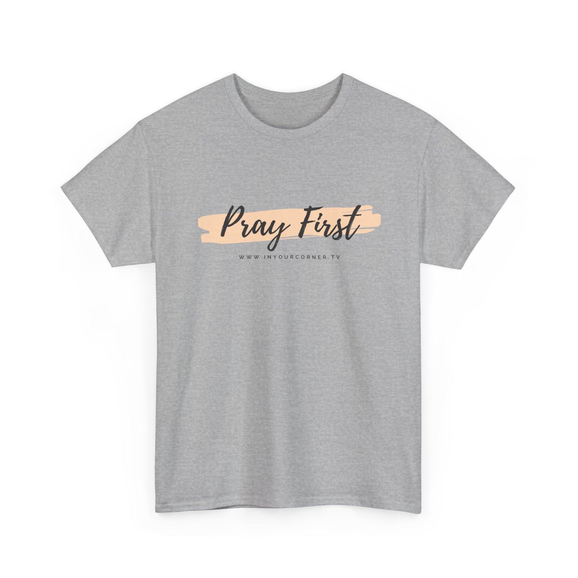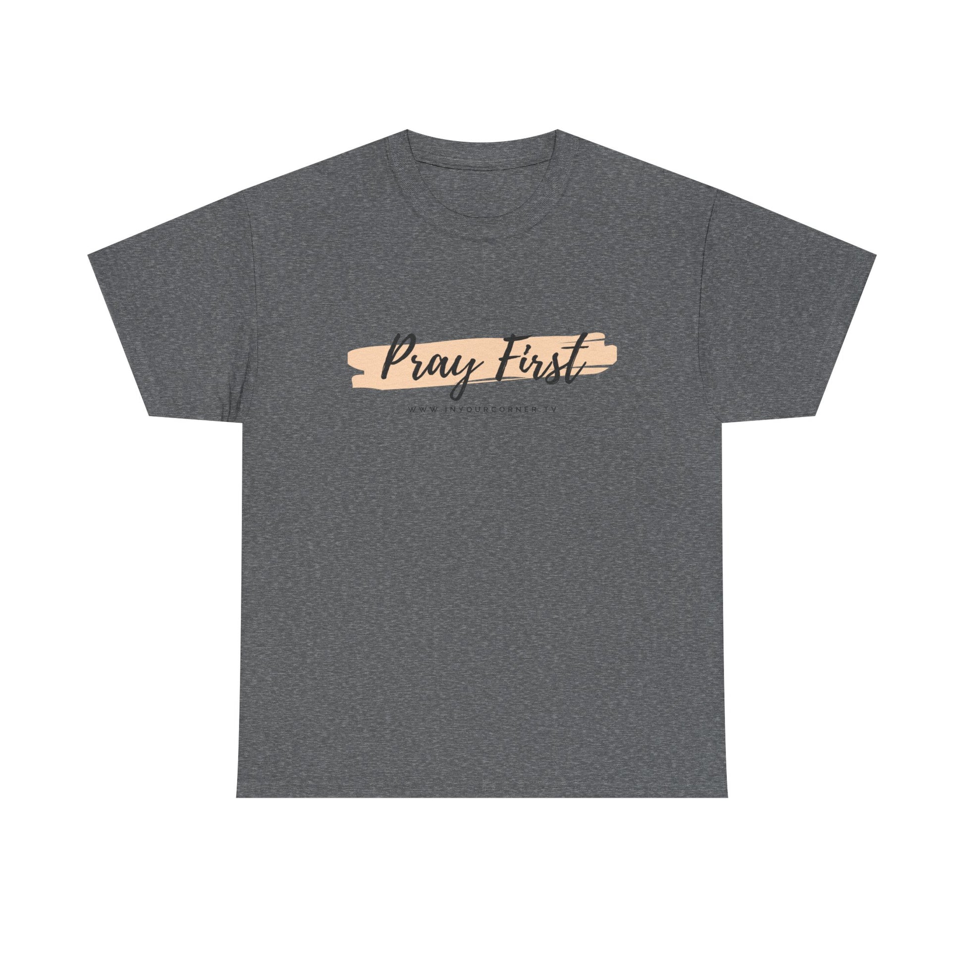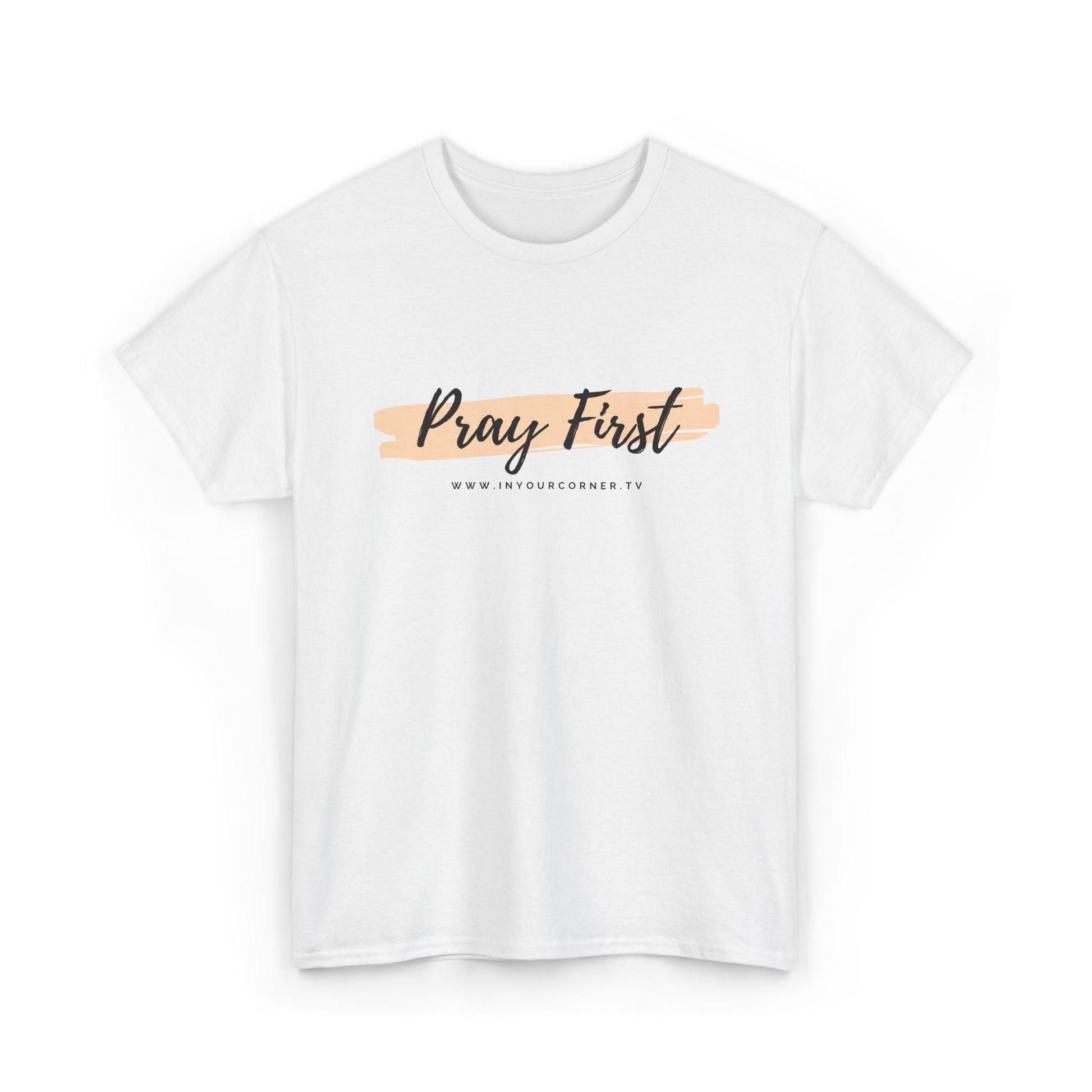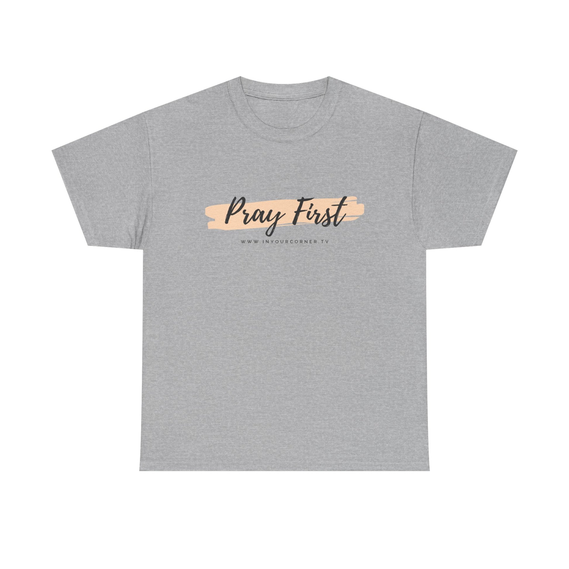 This soft cotton tee carries a quiet message: Prayer First. The design pairs a gentle brushstroke of warm peach with modern, hand-lettered script—subtle, personal, and easy to wear. Lightweight but sturdy, the shirt sits relaxed at the shoulders and breathes through everyday rhythms: morning coffee, volunteer shifts, or low-key church gatherings. It layers simply under a denim jacket or pairs with joggers for comfort while you go about your day. The feel is calm and intentional—an outward nod to an inward habit.