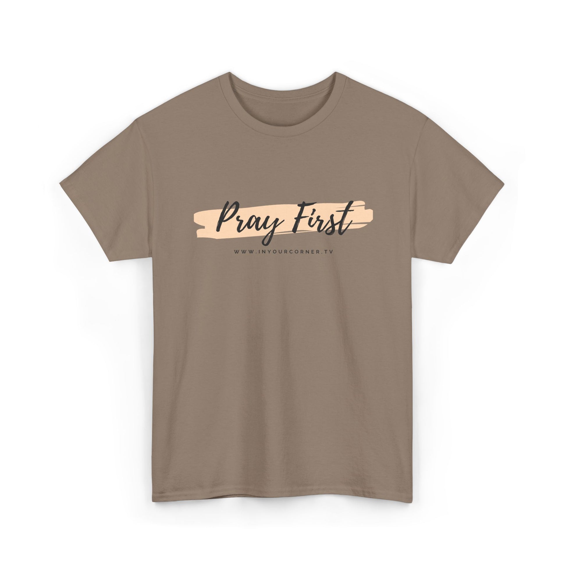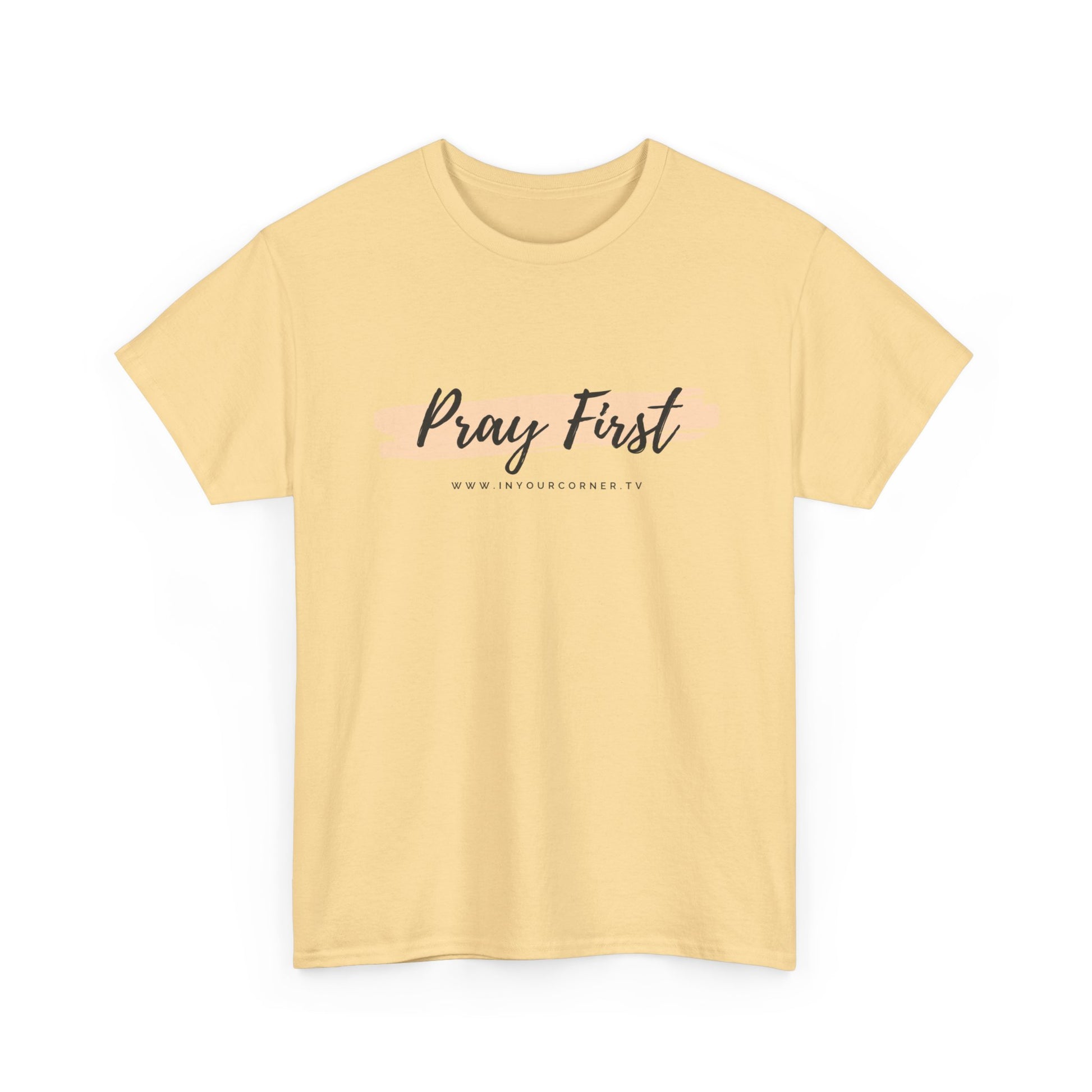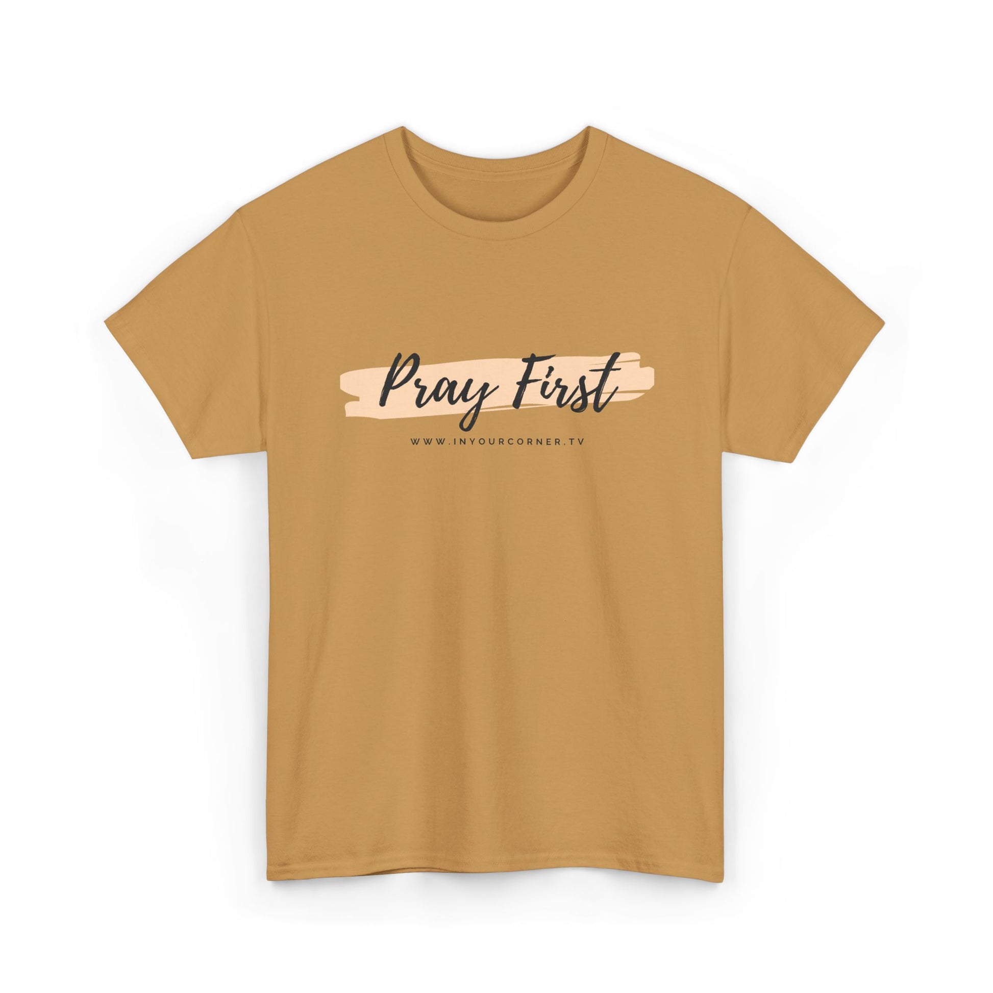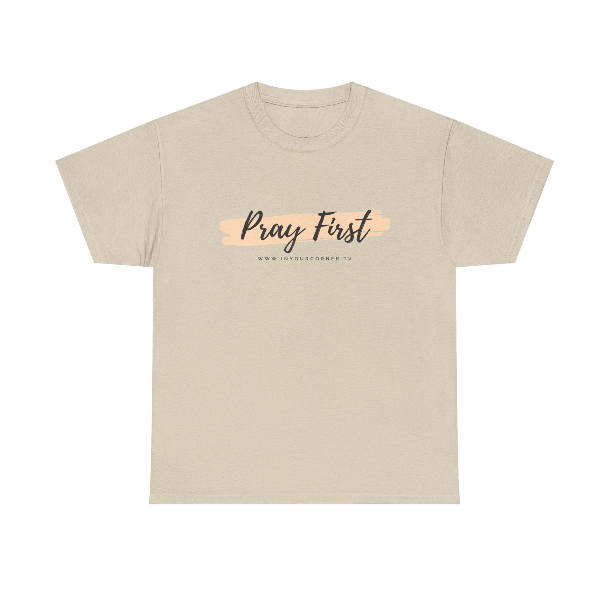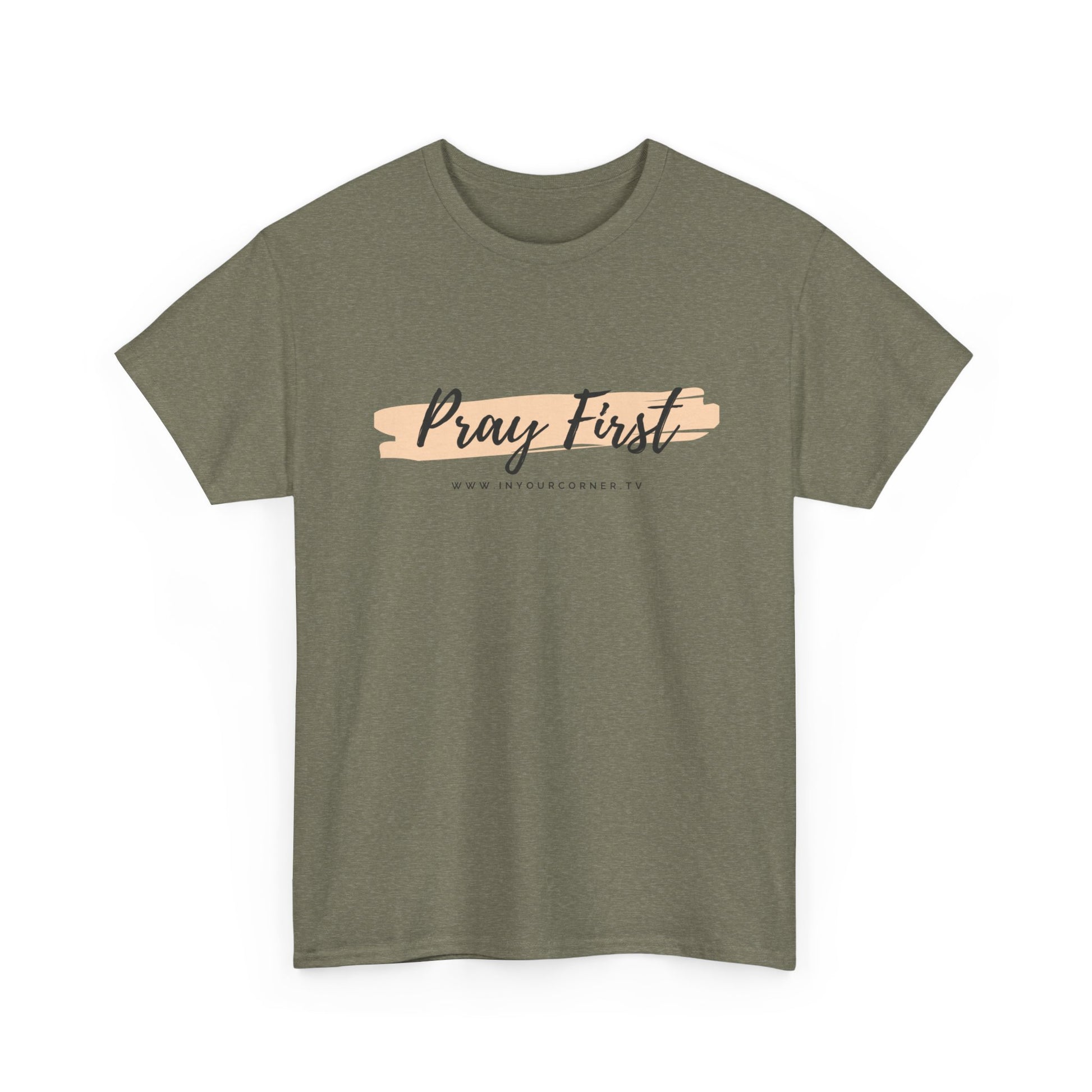 This soft cotton tee carries a quiet message: Prayer First. The design pairs a gentle brushstroke of warm peach with modern, hand-lettered script—subtle, personal, and easy to wear. Lightweight but sturdy, the shirt sits relaxed at the shoulders and breathes through everyday rhythms: morning coffee, volunteer shifts, or low-key church gatherings. It layers simply under a denim jacket or pairs with joggers for comfort while you go about your day. The feel is calm and intentional—an outward nod to an inward habit.