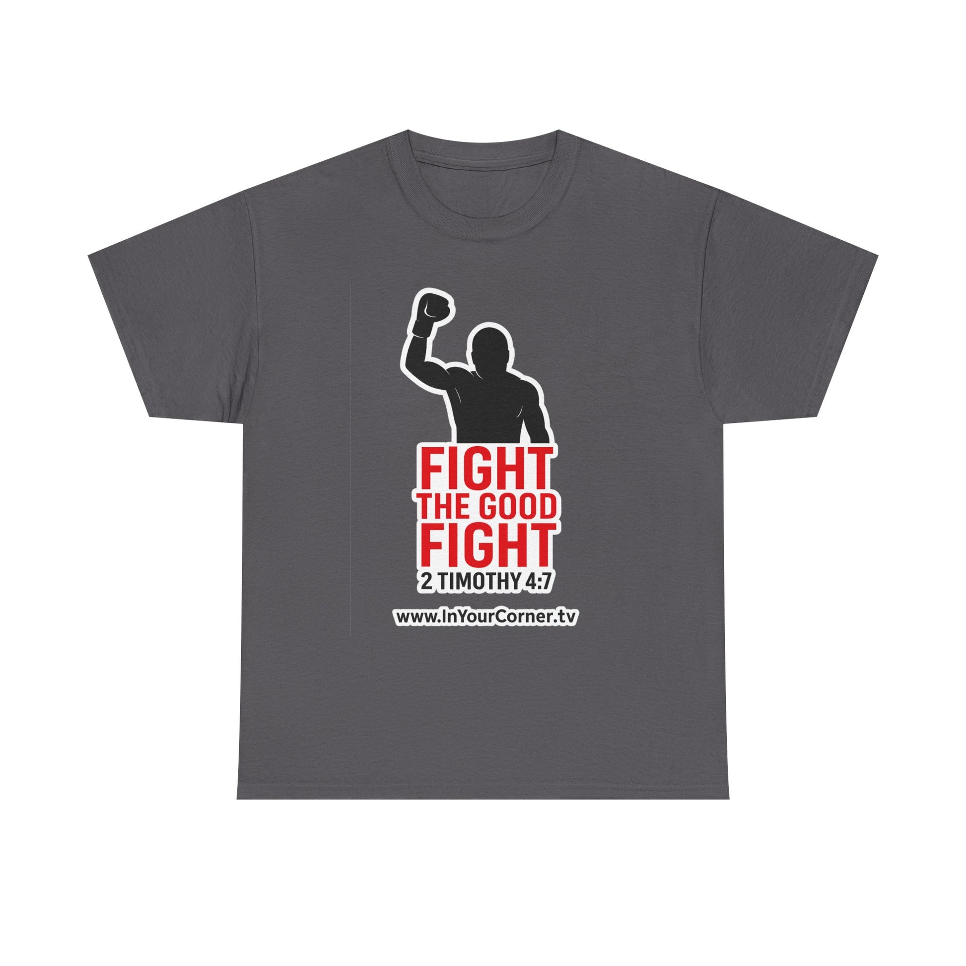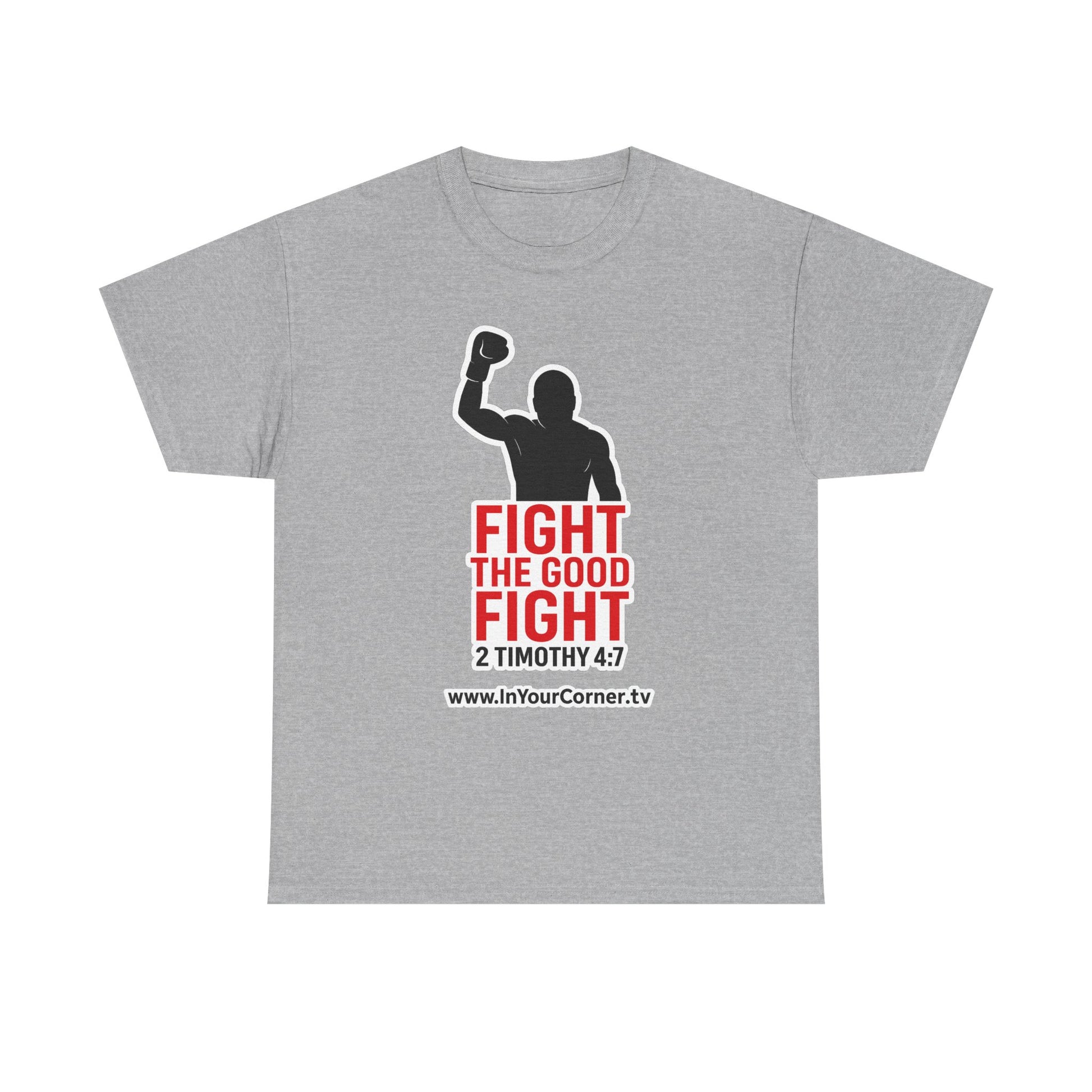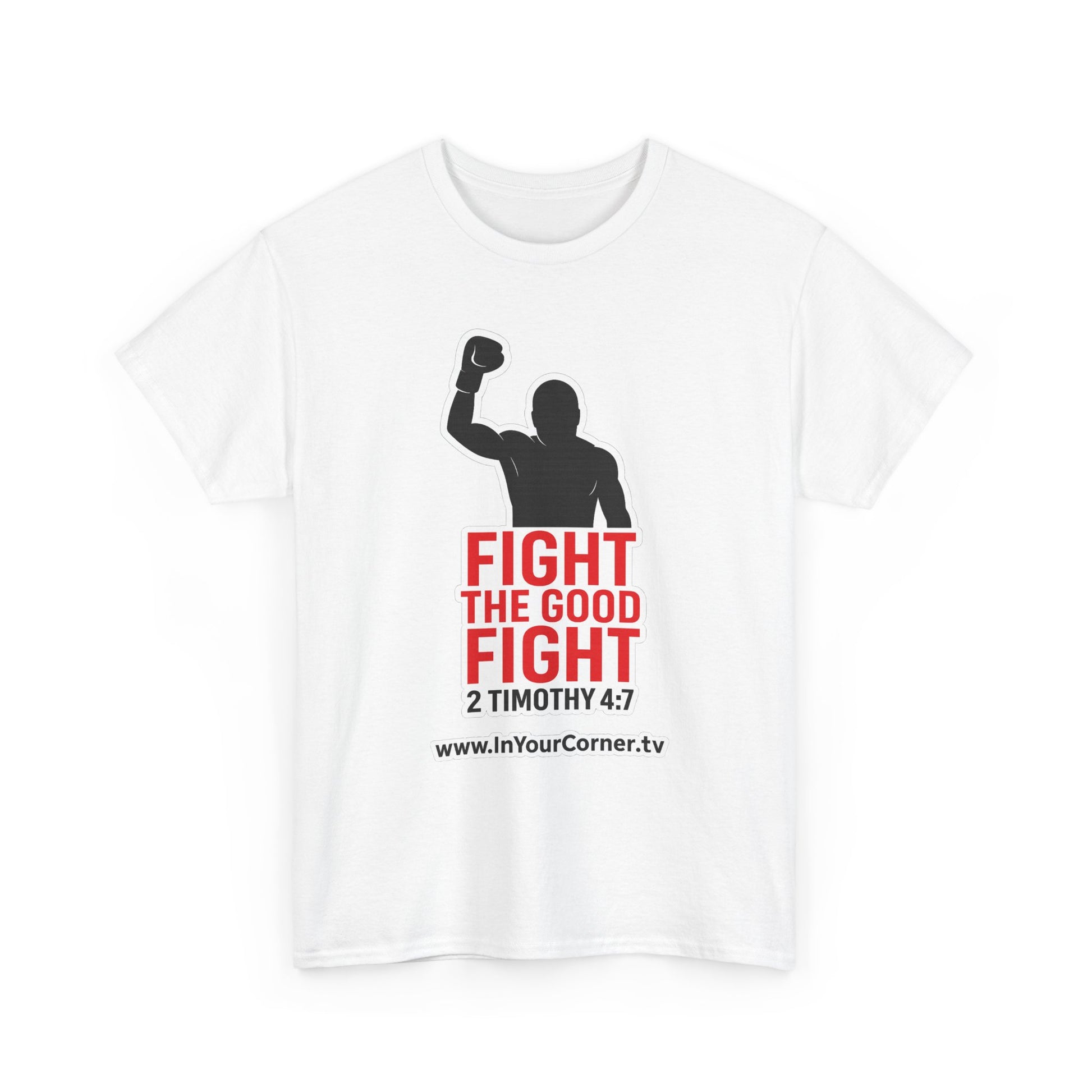This classic cotton tee carries a quiet, determined energy. A bold silhouette of a raised fist and the words "FIGHT THE GOOD FIGHT" sit over a simple scripture reference, creating a wearable statement of conviction and steady resolve. The medium-weight fabric and relaxed crew-neck shape make it comfortable for everyday wear—whether worn to a community meet-up, a church event, or while running errands. It reads like a gentle challenge: hold to what matters, stand with others, and move forward with faith. The clean white background lets the red and black print stand out, so the message is both visible and personal without shouting. It layers easily under a jacket or wears alone on a warm afternoon, fitting into quiet mornings of reflection or active, service-driven days.