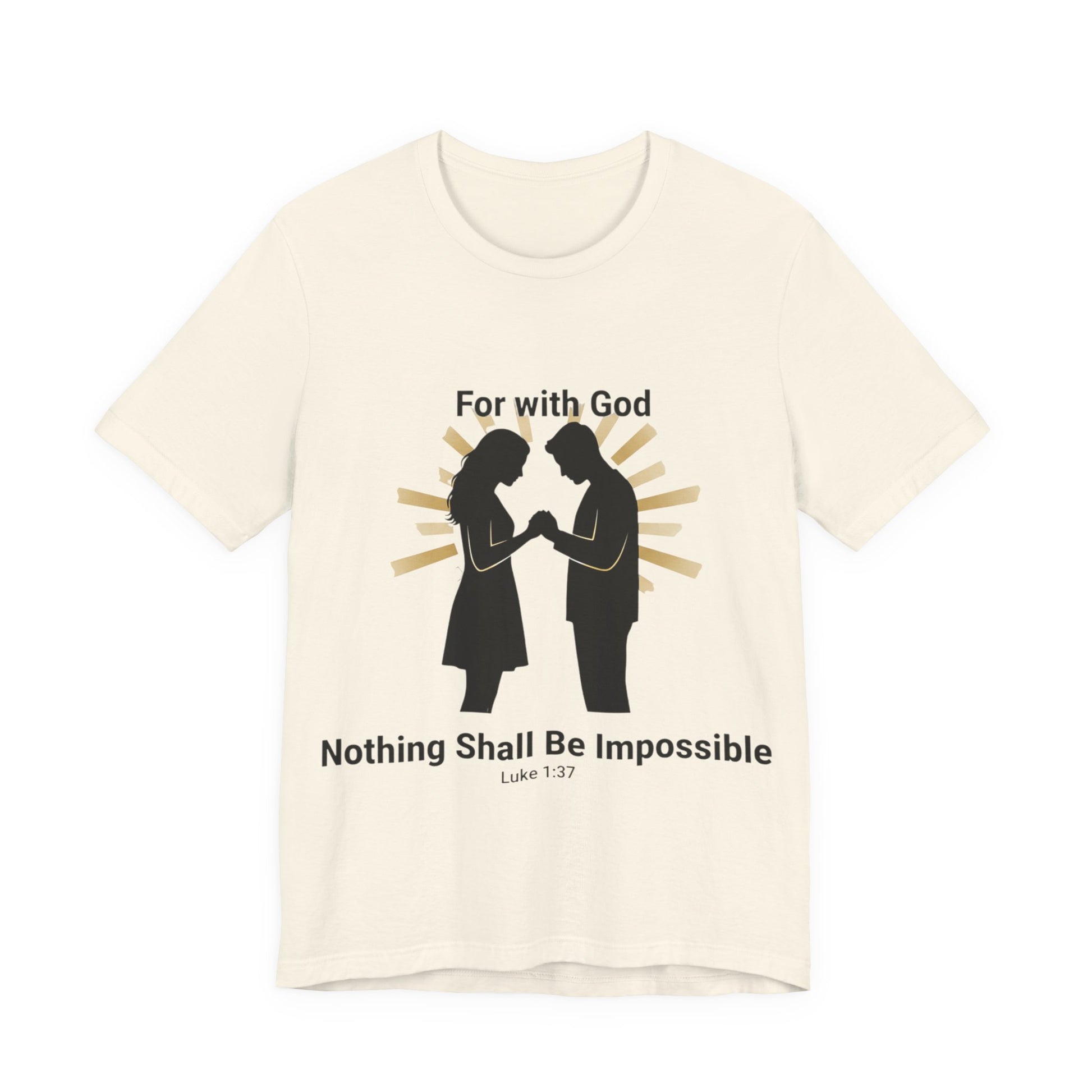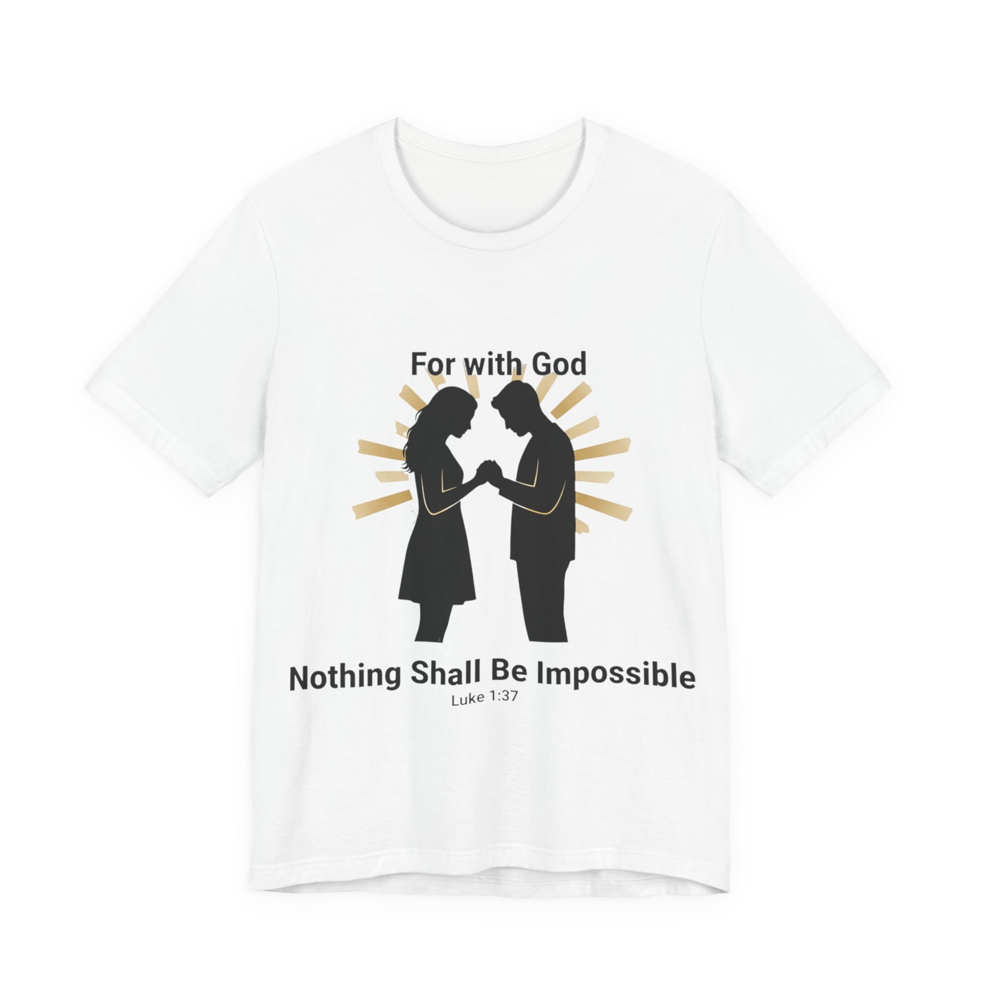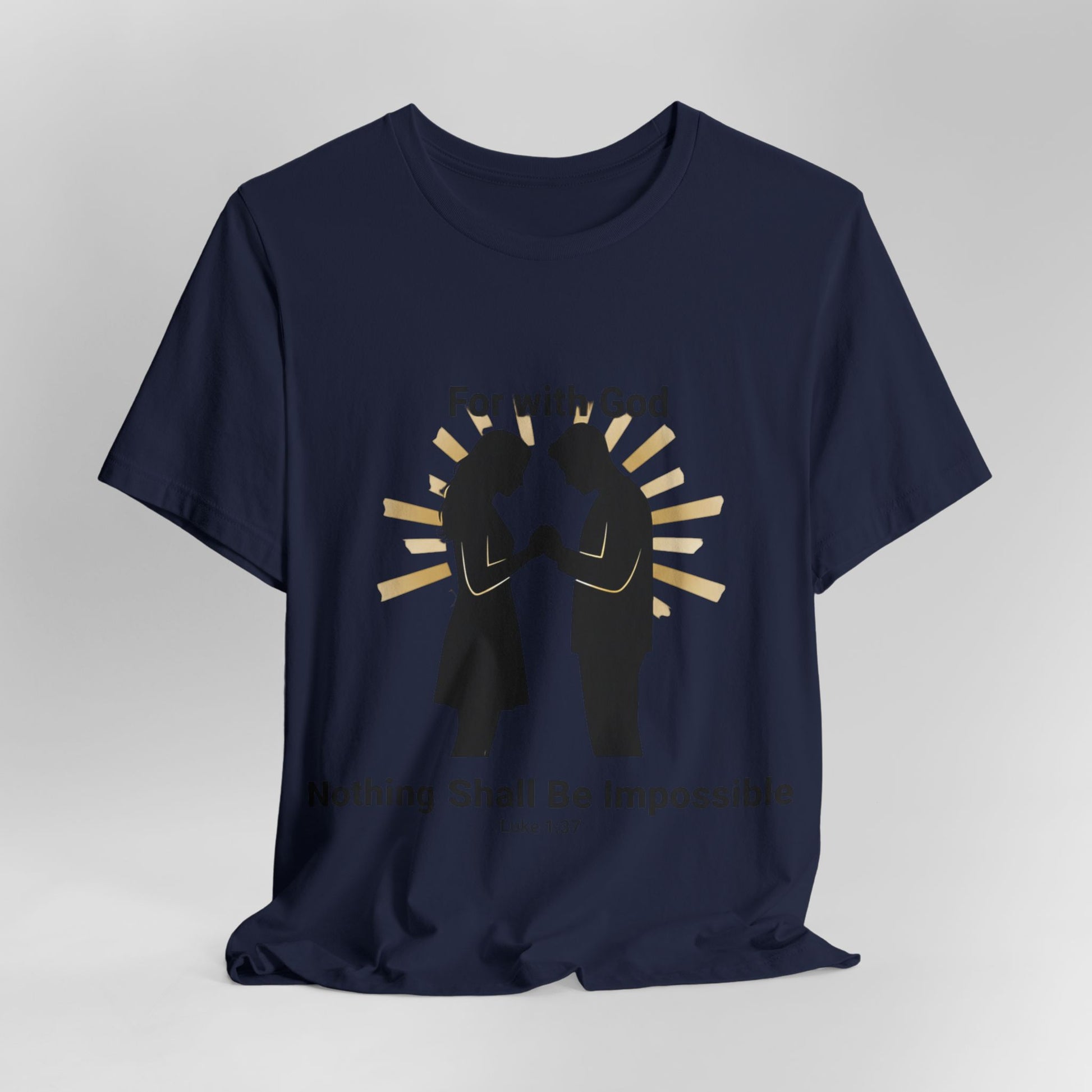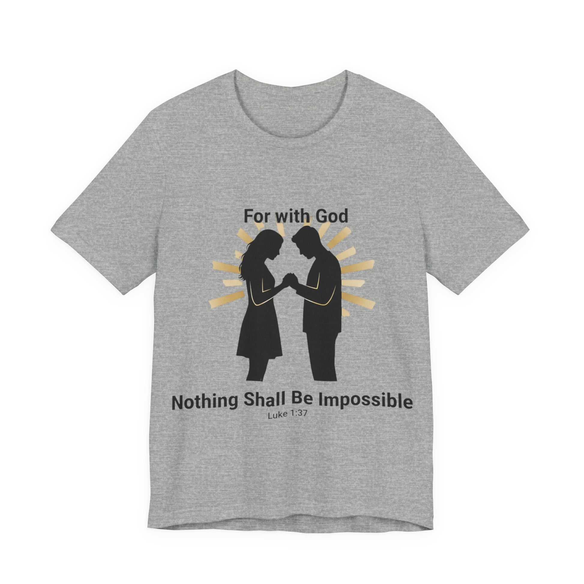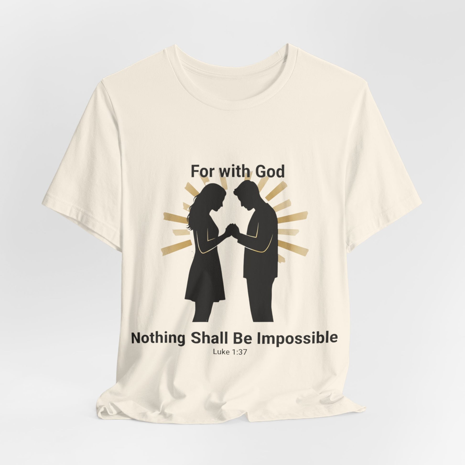 This lightweight jersey tee carries a bold, faith-forward message: that with God nothing is impossible. It drapes softly against the skin and sits with a neat retail cut, so the verse reads clearly whether you’re heading to church, a small group, or out into town. The breathable Airlume combed cotton keeps you cool during warm-weather worship or layered under a sweater on cooler mornings. Subtle construction details — side seams, ribbed collar, shoulder tape and a tear-away label — keep the shirt comfortable and long-lasting, so your message stays crisp through many wears and washes. Sleeve and neck-printing use modern DTF/DTG techniques for precise, vibrant lettering that won’t fade quickly. Made with attention to fair labor practices and REACH compliance, this tee pairs everyday comfort with a faith-centered statement you can live in.